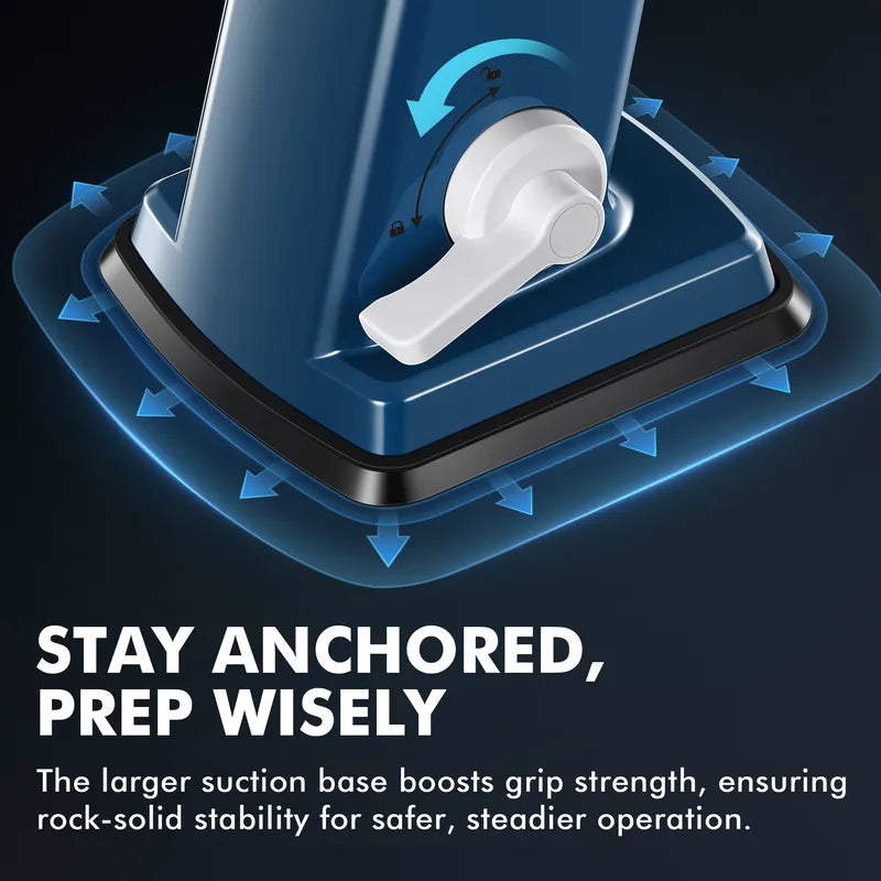 The strong silicone suction base locks firmly onto smooth surfaces, while the food pusher keeps hands away from the blades—making it a reliable choice for busy families.